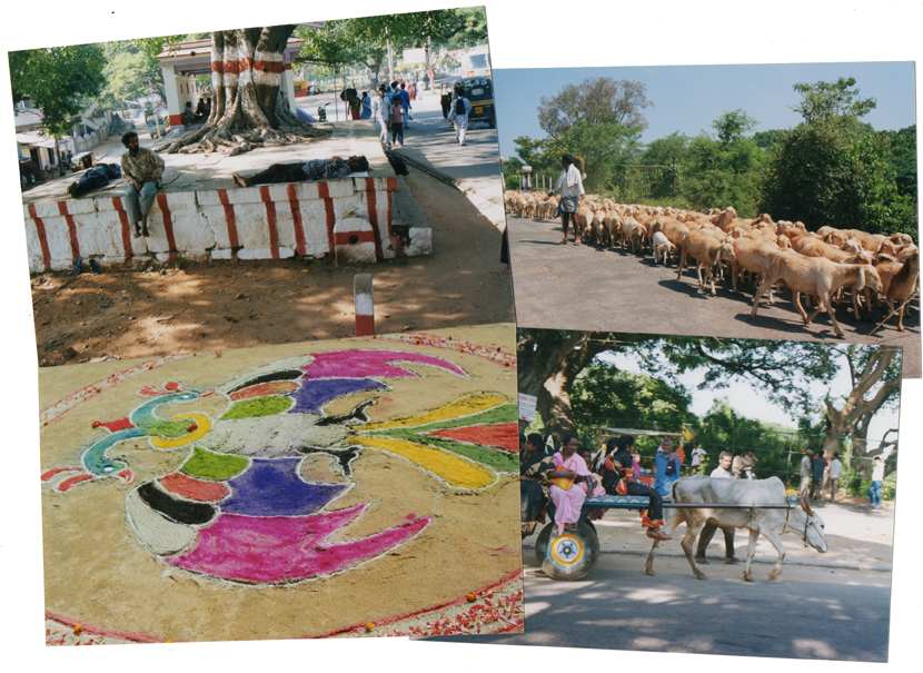 Coming to India for the first time and attending an artists workshop for the first time has been a rich and overwhelming experience for me. Everything in Mysore is new: the customs of the people, the fusion of city and farm, the colours of the earth and blossoms of the trees, the smell of jasmine everywhere and a chaos that adds life to the world that I find myself describing as “crazy”, bizarre”, “beautiful”, “wild”, “surreal”.