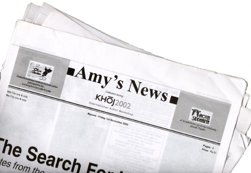 The paper is named after a newsagents shop in East London I noticed on the evening before I left for India 12 days ago. It seemed fitting because the paper really is a personal account. Not a diary exactly, but a record of incidents including the mundane – even a leaf falling from a coconut tree is news to me. I like the idea that if every person made a newspaper, how different they would be. The news stories have developed organically through conversation with those around; the staff at the Olive Garden, Khoj organisers and artists and local people visiting the evening slide shows. Some of these interactions gave leads to stories outside the Olive Garden. They were a great pleasure to pursue.