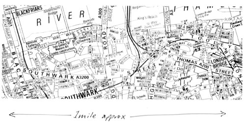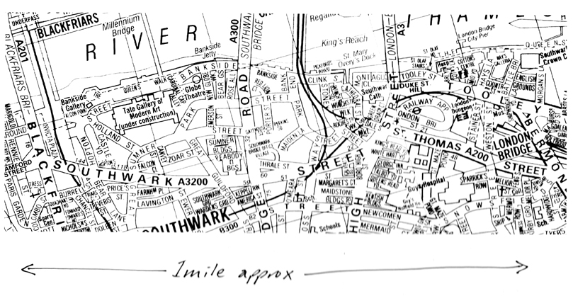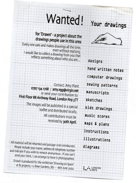 DRAWN a collection of drawings that people make and use in the area surrounding the gallery, fa projects, 1-2 Bear Gardens, Bankside, London SE1, UK for the exhibition Drawing on Space. 2002